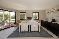 At the heart of the studio sits our design desk, equipped with the digital tools, samples, and reference materials that shape each project. It’s the place where floor plans are adjusted with care, palettes evolve, and final selections are pulled together. Surrounding it is our material library, offering textiles, tiles, stone, wood finishes, hardware, and color decks that clients can touch, compare, and explore. It’s a hands-on, immersive environment that makes the design process clear and enjoyable.